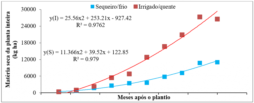 Figura. Matéria seca da planta inteira cultiva em localidade de clima quente/irrigado e clima ameno/sequeiro ao longo de 90 meses (6ª safra).