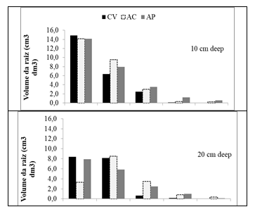 Figura 2. Representação gráfica do volume de raiz/volume de solo (cm3/dm3) de três cultivares de cafeeiro conduzidos em Patos de Minas MG em lavoura irrigada via gotejamento de 5 anos de idade. Cada gráfico representa 10 cm de profundidade e o eixo X representa a distância em relação ao tronco (cm). Fonte: